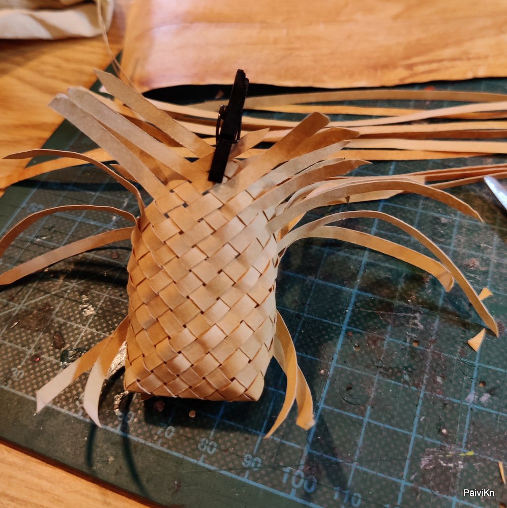 Taitava Mirka Salonen opasti tuohitöissä. Tuohi nukkekotikoossa oli oikeasti kopiopaperia, jonka toinen puoli oli vuorattu maalarinteipillä ja paperi oli maalattu sopivan väriseksi. Mirka oli tehnyt nämä jo meille kurssilaisille valmiiksi. Itse jouduimme ensi työksemme leikkaamaan 3,5 millin levyisiä suikaleita, joista sitten ryhdyttiin punomaan.
